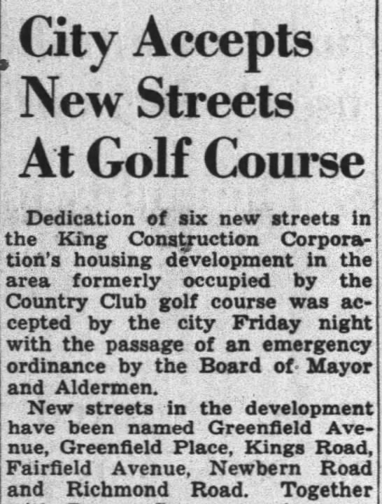 In 1947 (after World War II), there was a high demand for new housing in Kingsport. Enter King Construction Corporation (sometimes called King Development) headed by Glen Bruce. They developed Greenfields around six streets: Kings Road, Greenfield Avenue, Greenfield Place, Fairfield Avenue, Newbern Road, and Richmond Road. Wait, “Richmond Road”? But there isn’t a Richmond Road in Kingsport today. I wonder what happened?