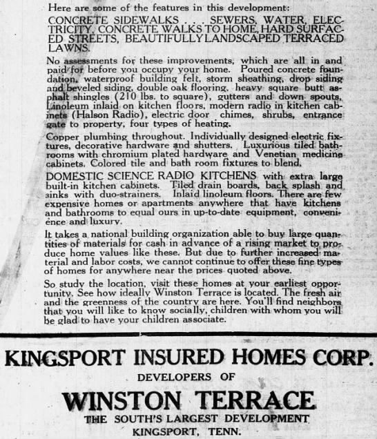 Ten years earlier, the 200-acre Kingsport Country Club was “forced out” (Kingsport Times, 1937). It was needed for housing and plans were made for the newly-formed Kingsport Insured Housing Corporation, headed by N.K. Winston and Arde Bulova of New York, to build up to 1000 new homes. It was marketed as “the South’s largest development” (Kingsport Times, 1937). But the world was on the verge of war and Kingsport’s defense industry needed housing—now. So, the plan for “Winston Terrace” shrank to include only the 1600 blocks of Carolina, Pineola, and Woodside (now East Sevier).