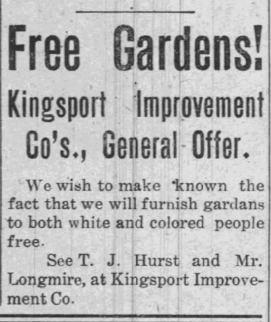 This ad appeared in the May 10, 1917, issue of the Kingsport Times. The primary town developer, the Kingsport Improvement Company, stated, “we will furnish gardens to both white and colored people free.”