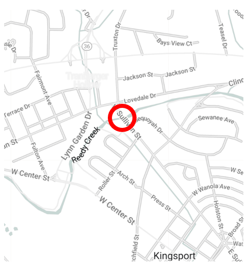 The bridge was located at the major intersection of the day–where the Great Stage Road (Netherland Inn Road / Sullivan Street), Reedy Creek Road (Bloomingdale Pike), and Scott County Road (Lynn Garden Drive) converged.