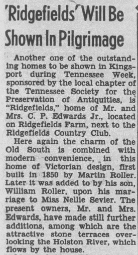 The Ridgefields House (pictured below) was originally built in 1850 by Martin Roller, 11 years before the American Civil War. That makes it antebellum (which means ‘before war’). Later it was added to by his son, William Roller, upon his marriage to Miss Nellie Sevier (a distant niece of John Sevier, Tennessee’s first governor). The Roller family is one of the most famous early names in Kingsport. They owned much of the land in what is now the modern City of Kingsport, including tracts from the Roller-Pettyjohn Mill in Fall Creek to Fort Henry Mall to Ridgefields Country Club.