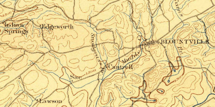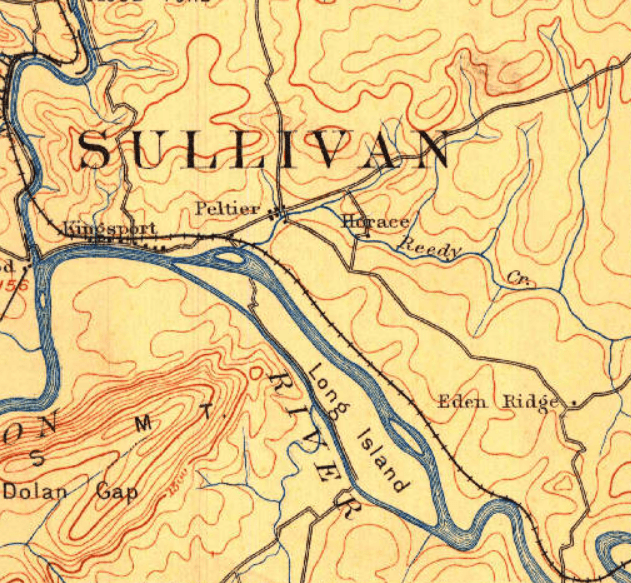 On 1894 USGS maps, the intersection known as “Peltier” marked a significant center of commerce from the post-Civil War era until Kingsport’s incorporation in 1917. Although today the entire valley is considered part of Kingsport, Peltier was nearly two miles from the riverport and functioned as an independent community. The next settlement to the east was Eden’s Ridge, located approximately 3.7 miles away—a considerable distance at the time, emphasizing how distinct these communities were from one another.
