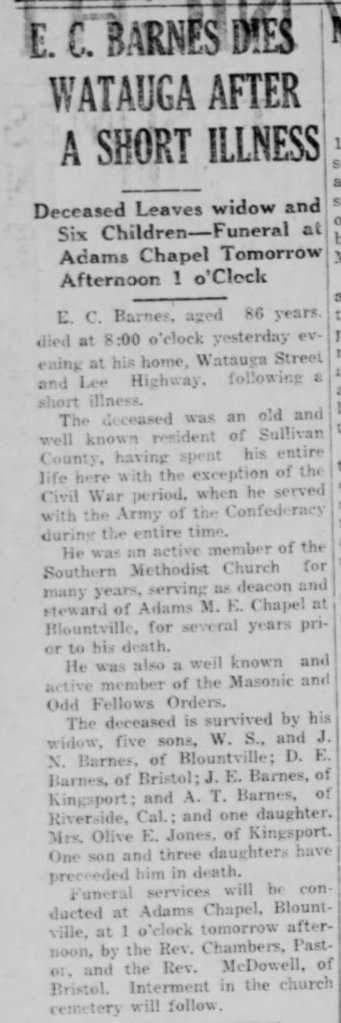 E.C. Barnes was born in 1842 and died in 1928. He enlisted in the Confederate Army’s 59th Tennessee Infantry at Bluff City in 1862 at age 20.