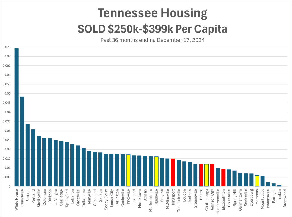 With that in mind, we examined Tennessee’s top 50 markets to see what patterns emerged. The yellow are the “Big 4” cities, while the red represent Northeast Tennessee.