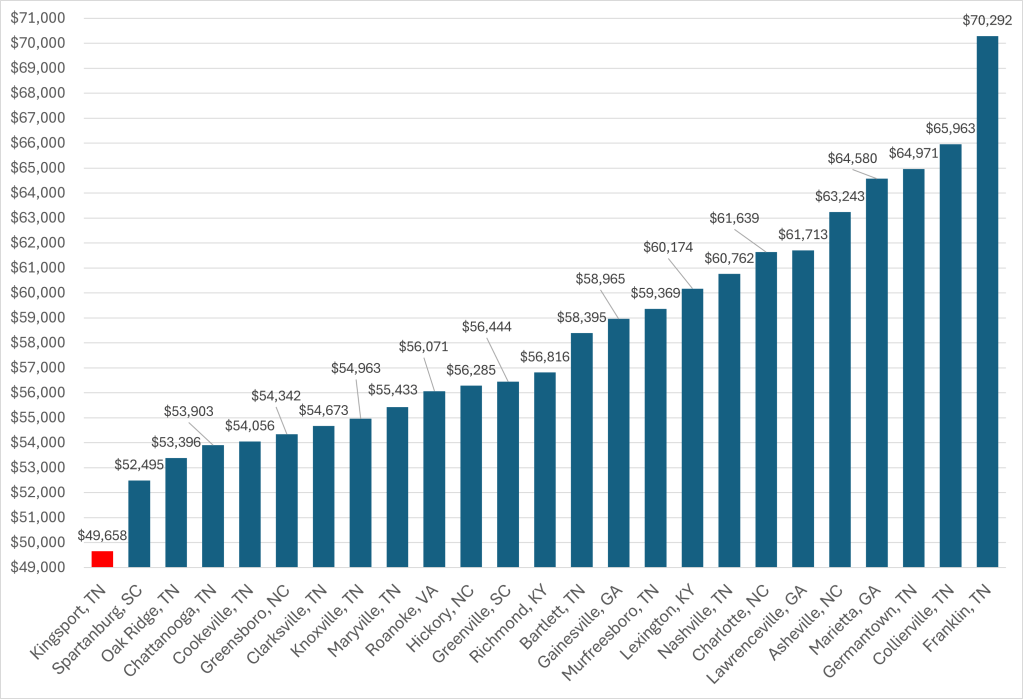 It’s common to hear about recent college graduates receiving higher-paying job offers outside the region and comparing them to similar positions here. However, those comparisons often overlook critical factors, such as cost-of-living and tax implications, which can make a significant difference. Even within Tennessee, where the state government and tax structure are consistent, living costs can vary widely.