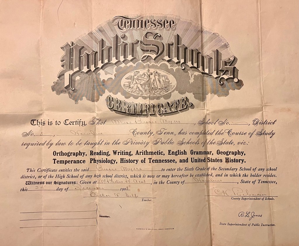 In 1900, the census shows my grandfather, then 14, living with Samuel in Hawkins County, Tennessee. By 1910, at age 24, he had moved to Butler County, Ohio, presumably for work. My grandmother, meanwhile, received her teaching certificate at 15 in 1908 and entered East Tennessee State University for one semester in 1912 at age 19. Her mother passed during the summer, and she never returned to college.