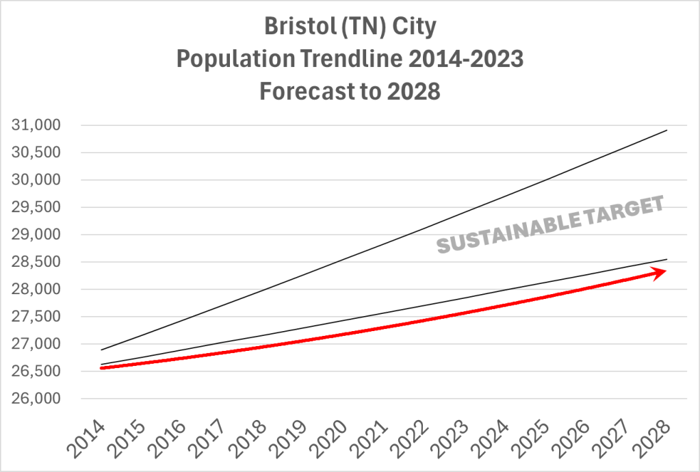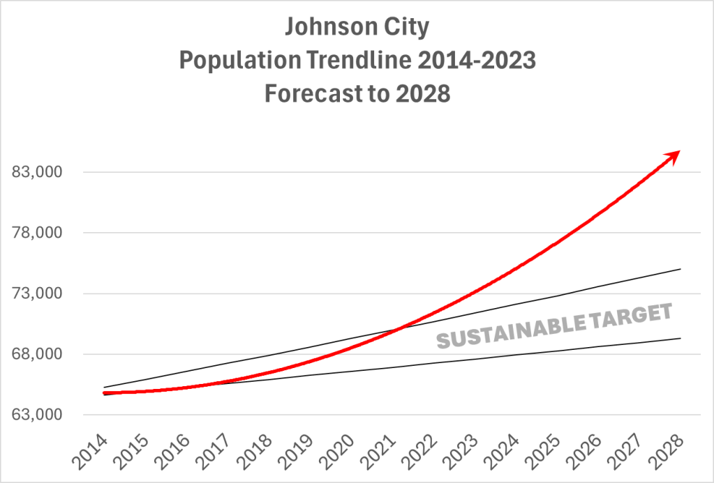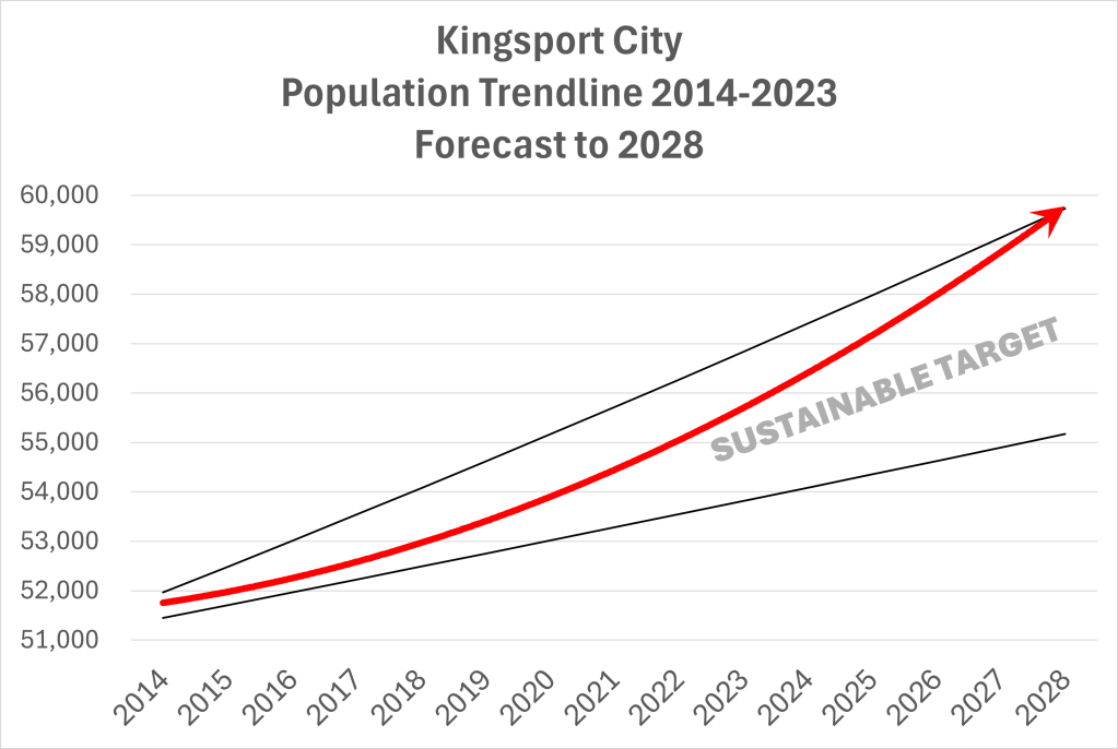 Looking at Kingsport’s growth since 2014 and projecting it forward through 2028 reveals that the city is on track to remain in the “sweet spot” (the sustainable target). This assumes that trends from the past 10 years continue. If they speed up or slow down, the outcome will be felt down the road.