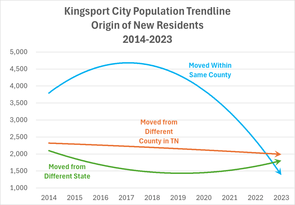 Newcomers from out-of-state, while relatively small in numbers, are keeping Kingsport afloat (see chart below). It’s the only component that’s on an upward trajectory.