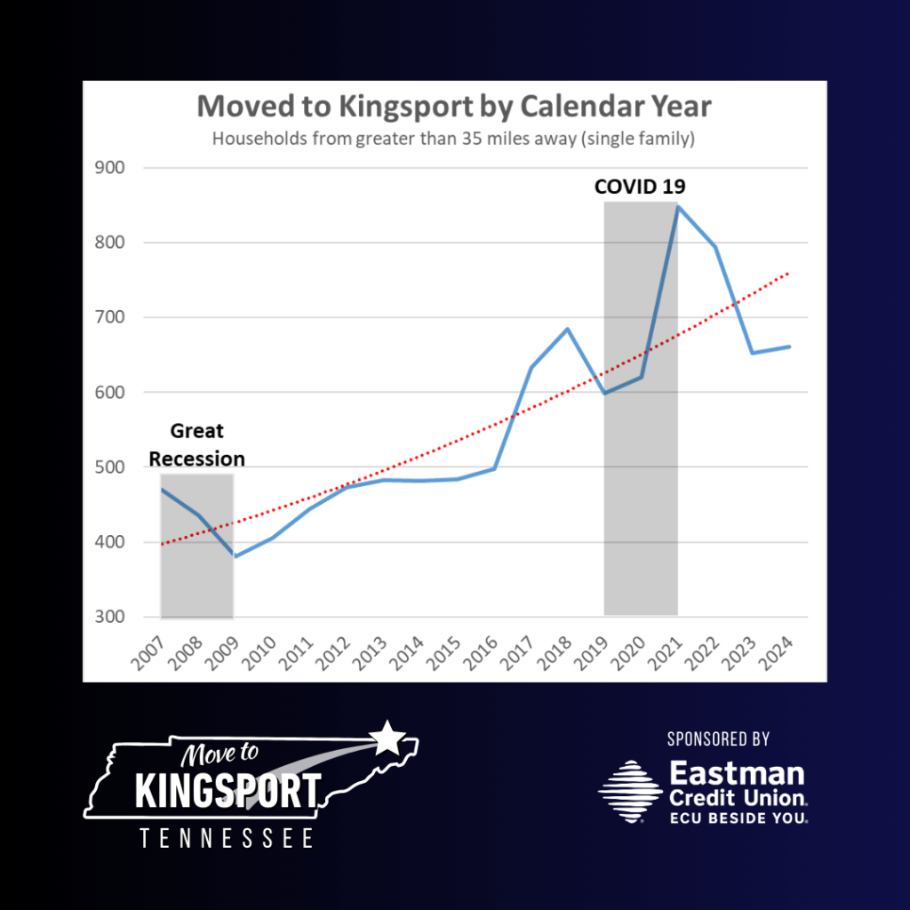 In 2007, an average of 39 families per month moved to Kingsport from beyond a 35-mile radius. By 2009, that number had dropped by 19% due to the recession but rebounded by 2012. By 2017, homebuilding surged, with a 27% increase in out-of-state newcomers over the previous year.