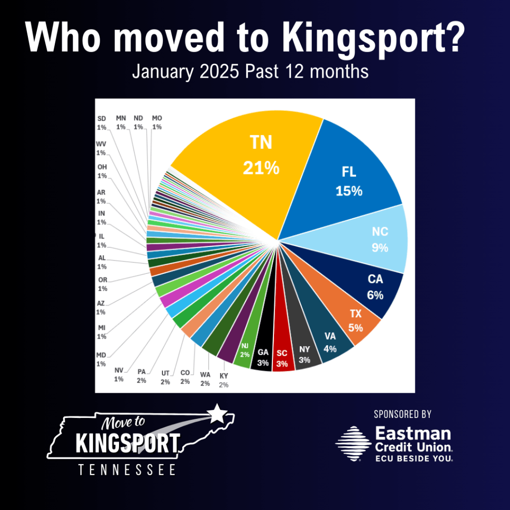 Like much of Tennessee, Kingsport experienced a significant influx of out-of-state residents during the post-COVID Great Migration. State policies, school and business disruptions, and affordability concerns drove many to leave expensive urban areas for locations offering more space and a better quality of life. By 2021, out-of-state migration had grown by 80% over pre-recession levels and 33% over 2019, continuing into 2022.