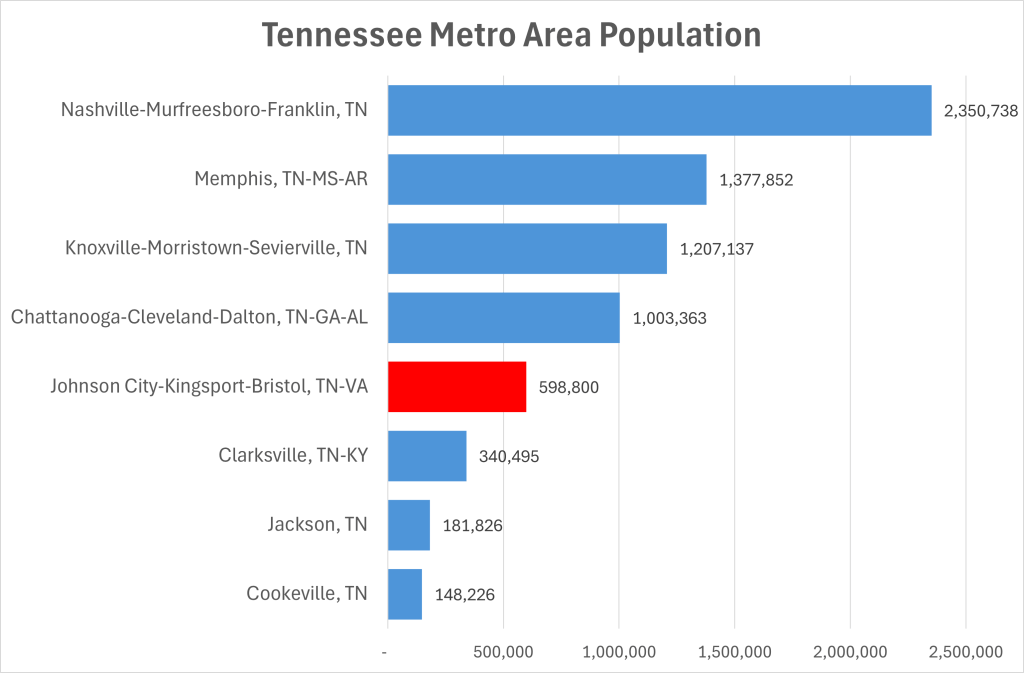 Looking at metros with similar populations to ours, Johnson City-Kingsport-Bristol, TN-VA feels like a great fit.