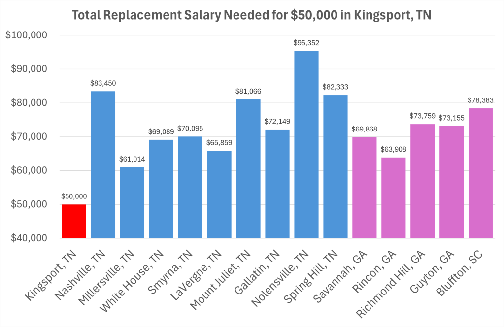 The final results? If you earn $50,000 in Kingsport, you’d need $61,000–$95,000 in Nashville and $69,000–$78,000 in Savannah to maintain the same lifestyle.