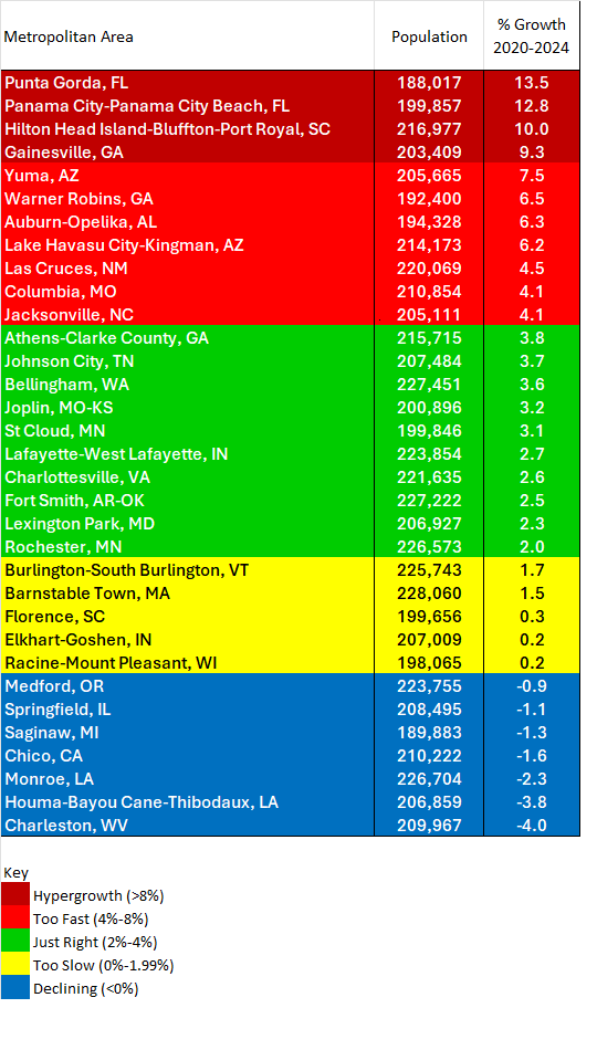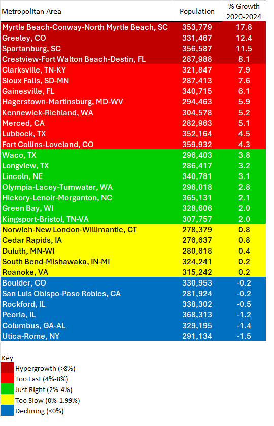 Kingsport-Bristol (pop. 307,757) and Johnson City (pop. 207,484) consistently land within this ideal growth range. While some areas within the region are growing faster and others are declining, they generally balance each other out—maintaining steady, sustainable growth.