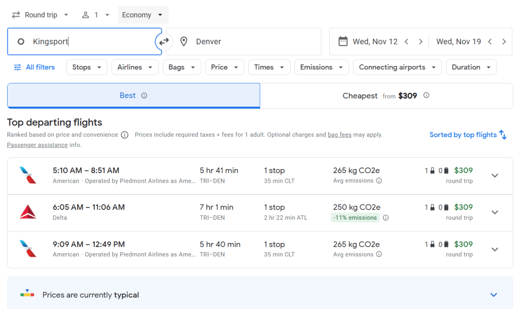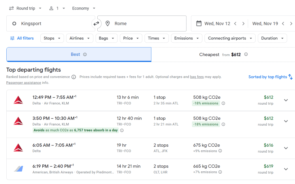 Just for fun, I checked flights from Tri-Cities to Rome—yes, Italy—in November 2025. At $612 per person, it wasn’t as expensive as I expected, especially compared to a domestic flight to Denver at $309.