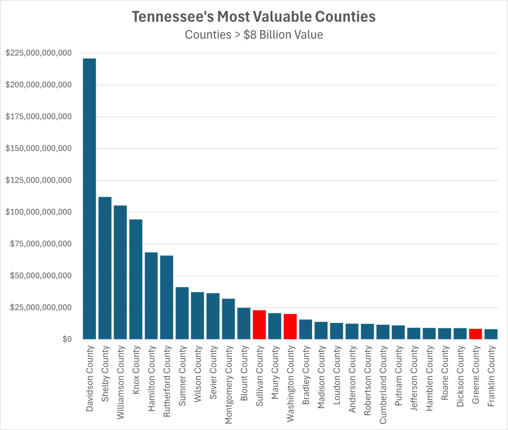 In the never-ending quest to explain this concept, I stumbled upon the Comptroller’s “Tax Aggregate Report of Tennessee”. I started by identifying the counties with a total property value greater than $8 Billion, which sounds like a lot until you realize that Davidson County (Nashville) alone is approaching $225 billion! Northeast Tennessee counties are shown in red.
