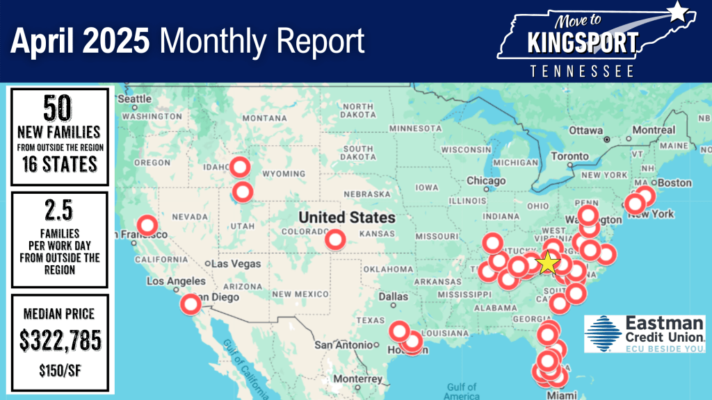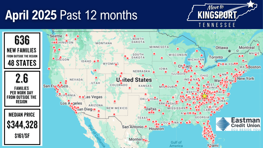 Kingsport is rapidly emerging as a nationally recognized relocation destination, with new data showing sustained and widespread interest from across the United States. In April 2025 alone, 50 families relocated to Kingsport from 16 different states—an average of 2.5 new families per workday. These new arrivals weren’t limited to nearby areas; families came from as far as California, Colorado, Texas, and the Northeast, highlighting the city’s broad appeal. Kingsport is no longer just drawing interest from within the region—it is attracting attention from across the country.