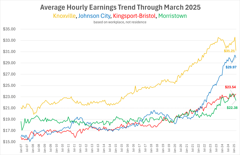 Since January 2007, Kingsport-Bristol’s average hourly earnings climbed from roughly $16 to $23.50 by March 2025—a 47 percent increase. That pace trails Knoxville’s 57 percent jump and Johnson City’s post-2020, 60 percent leap; yet it comfortably outpaces Morristown’s more modest 18 percent rise. The difference? Kingsport’s employers—rooted in manufacturing, healthcare, and logistics—have boosted wages in response to tight labor markets without triggering runaway inflation in local business costs.