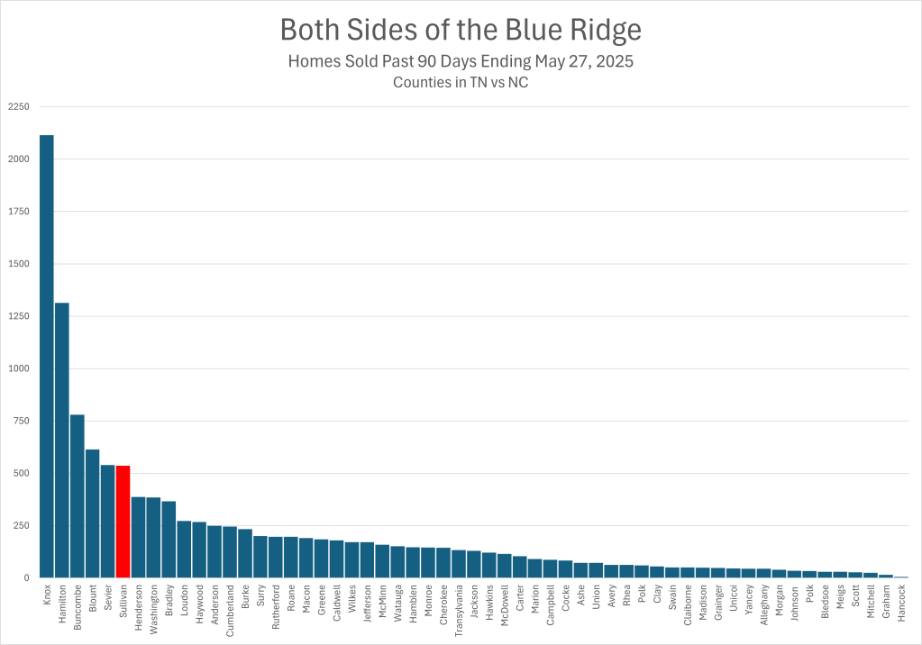 Over the past ninety days ending May 26, 2025, single‐family home sales across East Tennessee and Western North Carolina have offered a revealing snapshot of regional real-estate vitality. In Tennessee’s lineup of top markets, Sullivan County—anchored by Kingsport and Bristol—is a standout performer. With 3.3 closings per 1,000 residents, Sullivan is solidly in the upper tier—behind only the largest urban and resort‐driven markets—and well ahead of most of its North Carolina counterparts.