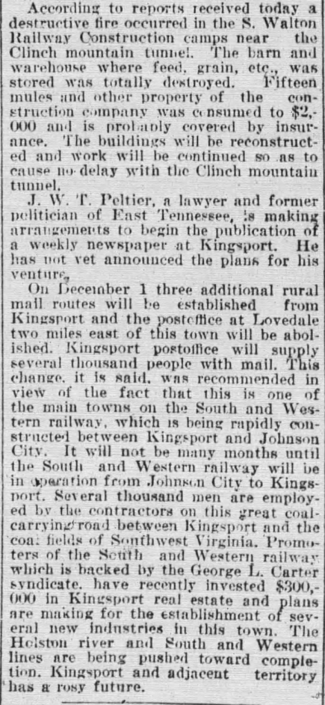 On December 1 three additional rural mail routes will be established from Kingsport and the postoffice at Lovedale two miles east of this town will be abolished. Kingsport postoffice will supply several thousand people with mail. This change, it is said, was recommended in view of the fact that this is one of the main towns on the South and Western railway, which is being rapidly constructed between Kingsport and Johnson City. It will not be many months until the South and Western railway will be in operation from Johnson City to Kingsport. Several thousand men are employed by the contractors on this great coal-carrying road between Kingsport and the coal fields of Southwest Virginia. Promoters of the South and Western railway, which is backed by the George L. Carter syndicate, have recently invested $300,000 in Kingsport real estate and plans are making for the establishment of several new industries in this town. The Holston River and South and Western bridges are being pushed toward completion. Kingsport and adjacent territory has a rosy future.”