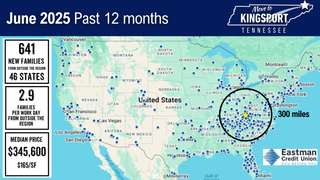Move to Kingsport’s rolling twelve-month metrics edged upward in June, signaling steady growth in inbound relocations. Arrivals ticked up to 641 families spanning 46 states (2.9 per workday), and median pricing rose to $345,600 ($165/SF). The previous period had 637 new families from 45 states—averaging 2.6 per workday—and a median home price of $343,078 ($161/SF). This incremental increase reflects a broadening geographic reach and ongoing demand.