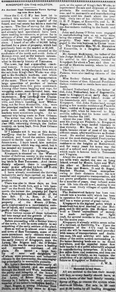 Kingsport is already within seven miles of a railroad, at Estillville, Va. (Gate City). Upon the completion of the 3 C’s road to that point she will be reasonably well provided with means of transportation and doubtless men, life, and activity will take possession of the entire section surrounding it. No better farming lands are to be found anywhere, and the superior water flow here marks it as a point admirably adapted to manufacturing enterprises. It is but a few miles from coal measures, and iron ore is in the near vicinity, so we venture the prediction of a pre-resurrection in the near future at Kingsport or Rotherwood.