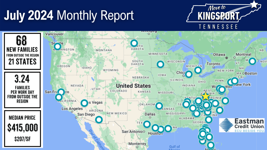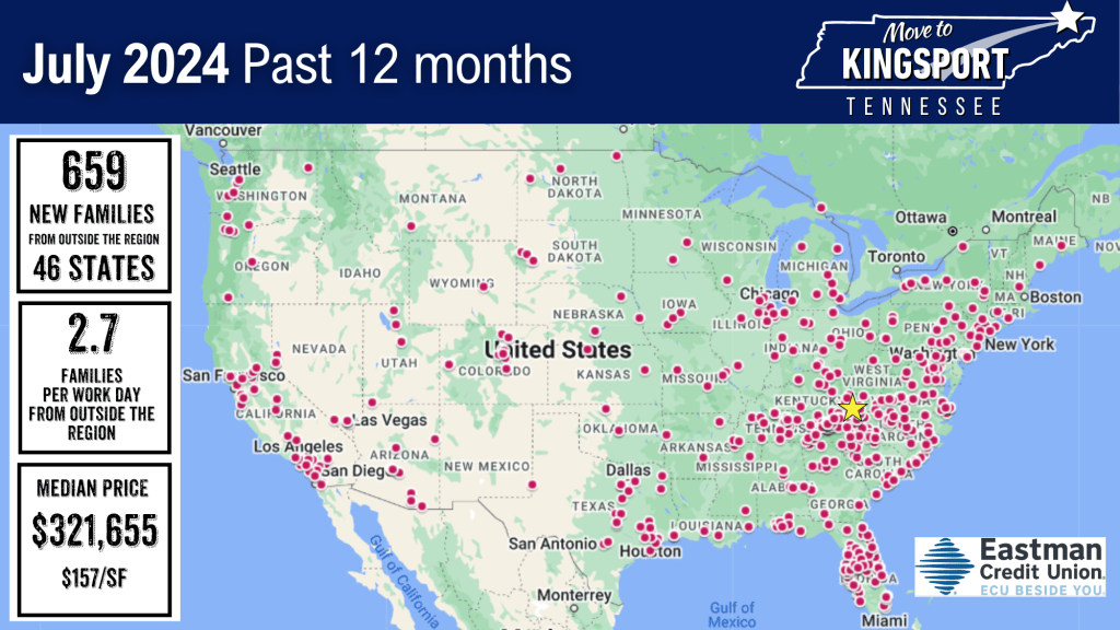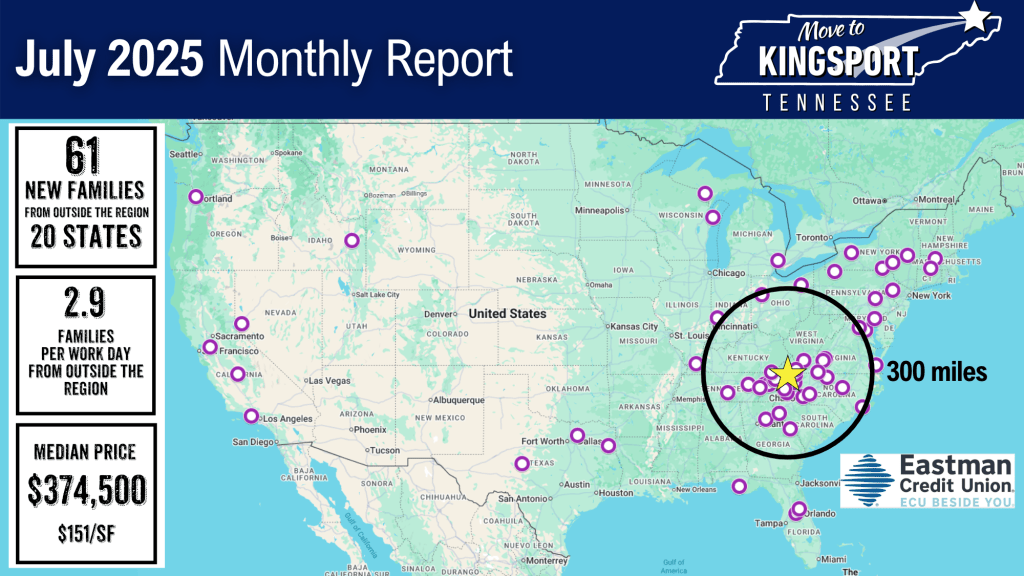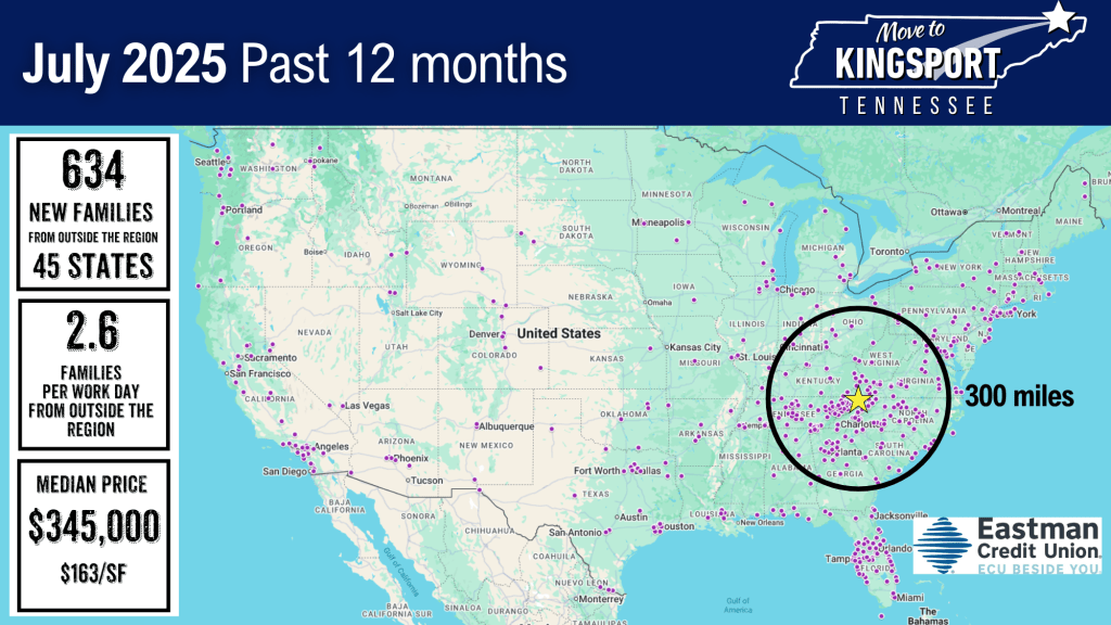 Maps of origin points reinforce that interpretation. In 2024 the scatter of pins was truly continental, sprinkled from the Pacific Northwest to Miami and Boston. Those long-haul moves still appear on this year’s map, but the densest cluster now lies inside a 300-mile radius of Kingsport—including Knoxville, Asheville, Roanoke, Charlotte, and the Piedmont Triad. The city is still a national draw (forty-five states sent newcomers in the past year), yet proportionally more buyers can scout the market in a weekend’s drive and haul a moving truck without crossing time zones. Fewer coastal “equity migrants” naturally tilt the price mix toward the middle.