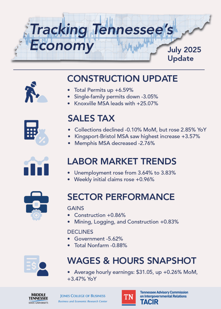 The Tennessee Advisory Commission on Intergovernmental Relations (TACIR) released its July 2025 report with a statistic that turned heads across the state. Kingsport-Bristol posted the highest retail sales tax growth in Tennessee at 3.57%, while Memphis, by contrast, recorded the largest decline at -2.76%. Overall, sales tax collections were down -0.1% statewide month-over-month, but up 2.85% year-over-year.