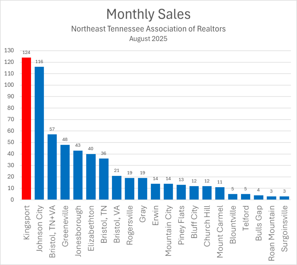 The August 2025 sales report of the Northeast Tennessee Association of Realtors shows Kingsport posted 124 closings and Johnson City 116—roughly 39% of all regional sales. That concentration tells you where buyers are most active.