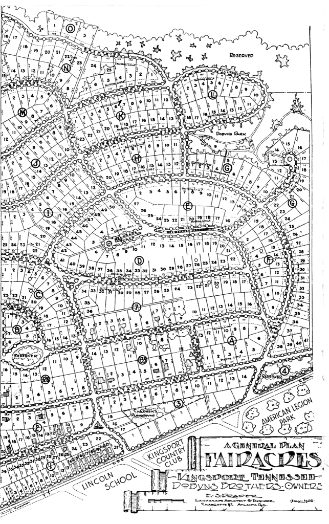 A current tax-parcel map of Fairacres (above) shows the original Draper layout and boundaries, while Draper’s 1926 General Plan for Fairacres (below) is telling: the left and right edges aren’t cut off by accident; those were the actual boundaries that followed the Dobyns Farm–from East Center Street (then Bristol Highway) to the bluff overlooking Reedy Creek. That explains why earlier subdivisions were labeled “Dobyns Addition”.
