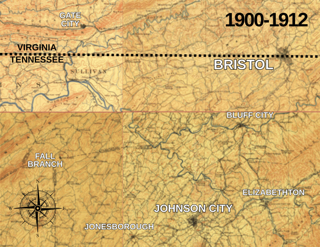 To put things in perspective, there wasn’t a “Tri-Cities” back then. Bristol was the heavyweight. Johnson City was nipping at its heels with the opening of a soldier’s home in 1901 (now the Veterans Administration Medical Center) and the East Tennessee State Normal School (now ETSU) accepting its first students in 1911. Gate City, Bluff City, and Elizabethton were substantial. Jonesborough and Fall Branch were noteworthy. And Kingsport is a large blank space.