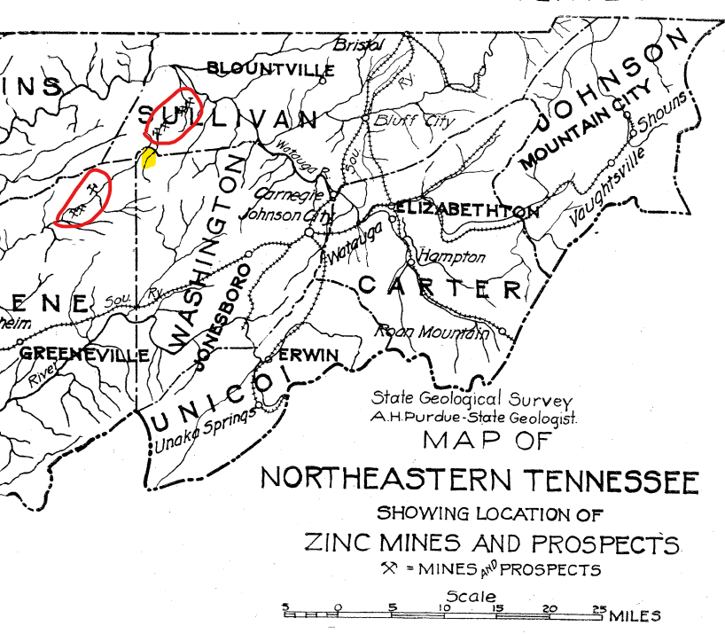 Inside was this 1912 map (below) showing zinc deposits (circled in red). For reference, Fall Branch is highlighted in yellow. Note that Kingsport isn’t shown on the map because it didn’t exist until five years later (1917). That’s hard to wrap my head around.