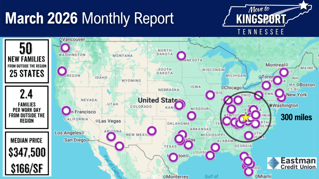 The biggest monthly sources were Tennessee, Florida, and Texas, with additional moves from states such as New York and Virginia (outside the Tri-Cities, TN/VA region). California was unusually quiet last month. The data suggests Kingsport continues to pull most strongly from the South and broader Sunbelt.
