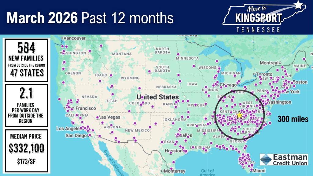 The past month shows that Kingsport’s out-of-region draw remains impressively wide. March’s moves came from 25 states, which is a broad footprint for a single month.